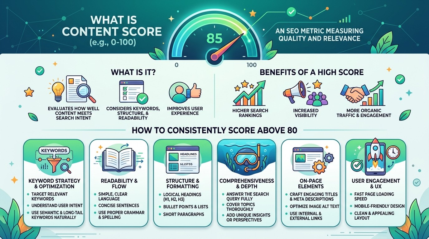 Content score is a metric used by SEO content optimization tools to evaluate how well a piece of content is optimized for a specific target keyword. If you have ever used platforms like Surfer SEO, Clearscope, MarketMuse, or Frase, you have encountered a content score. Understanding what drives this number and how to improve it can make the difference between content that ranks on page one and content that gets buried in search results.